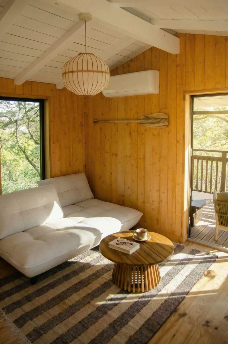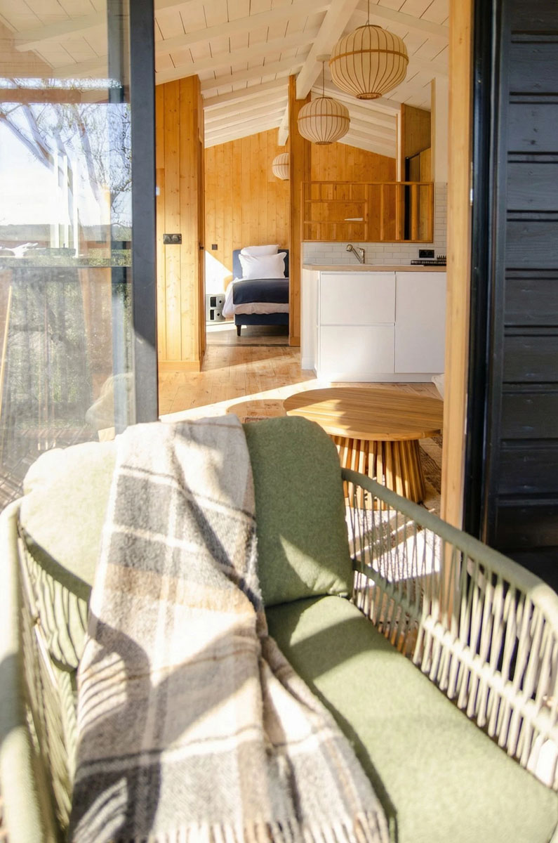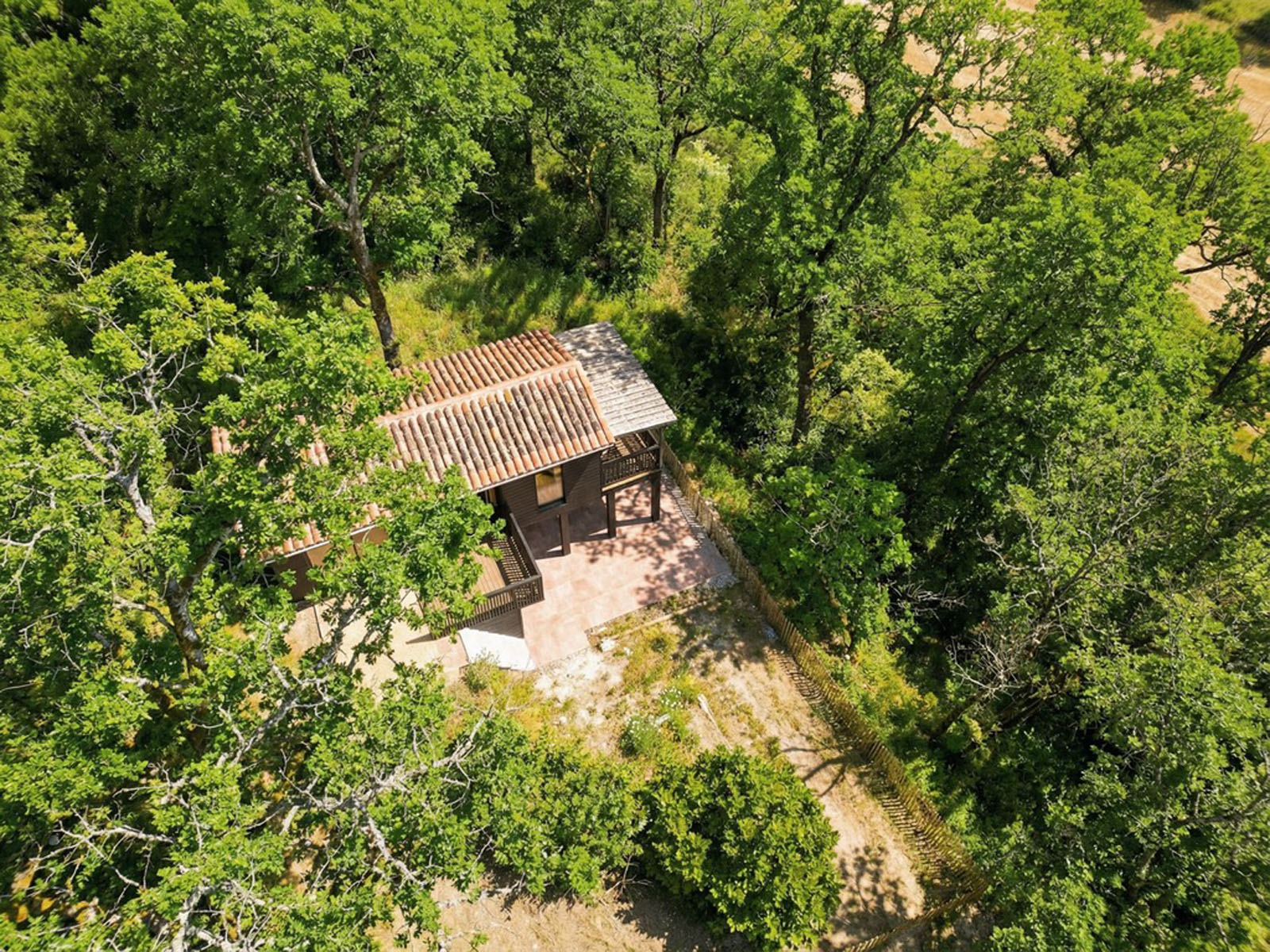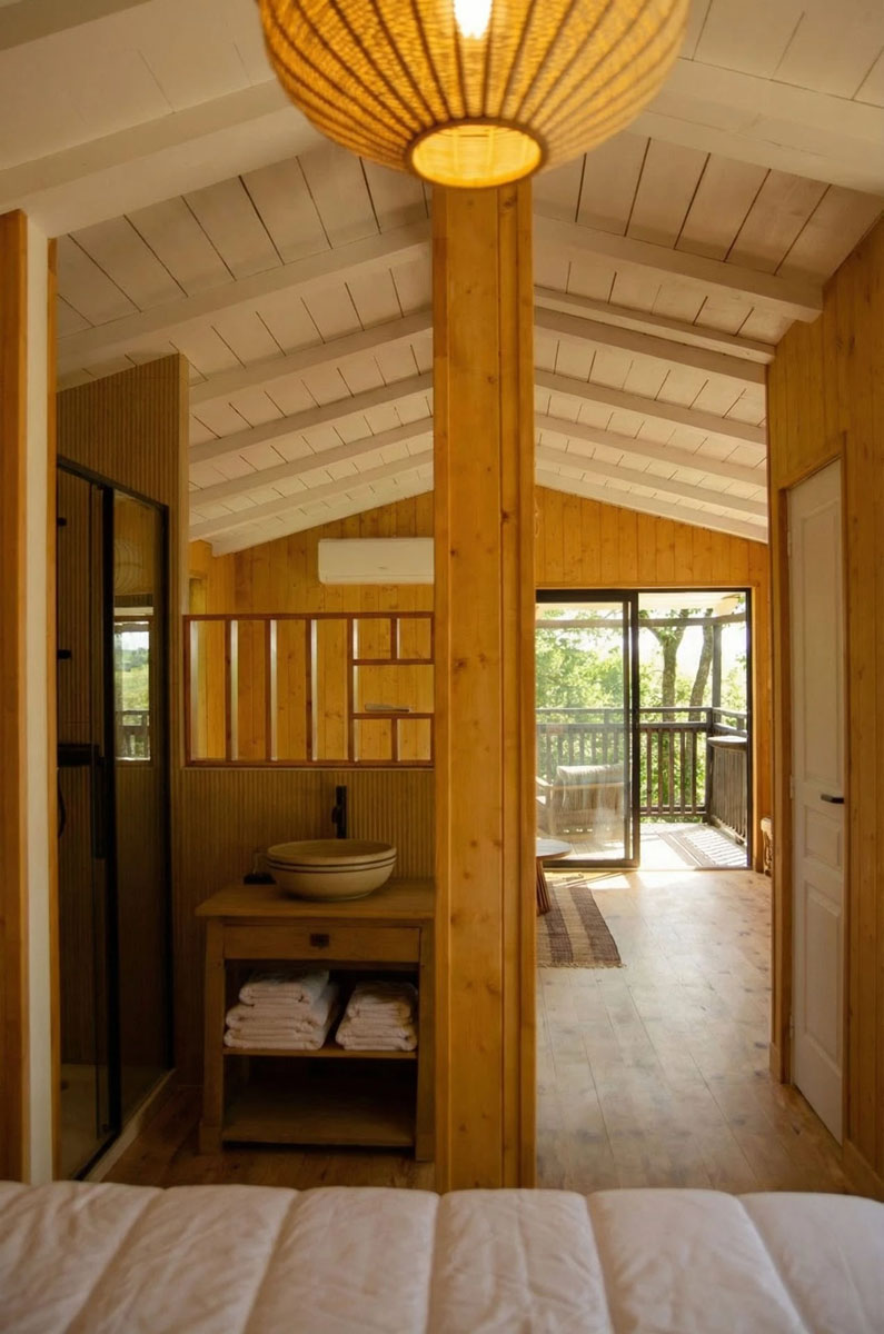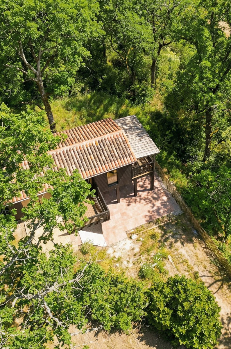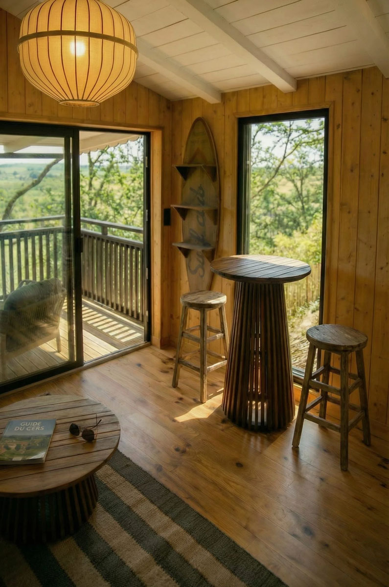 D’une superficie de 30 m², la cabane est entièrement conçue en bois et bénéficie de nombreuses ouvertures offrant une immersion totale dans la nature. L’espace est décloisonné (hors toilettes), permettant d’admirer la vue depuis la chambre et de profiter pleinement de ce logement insolite.